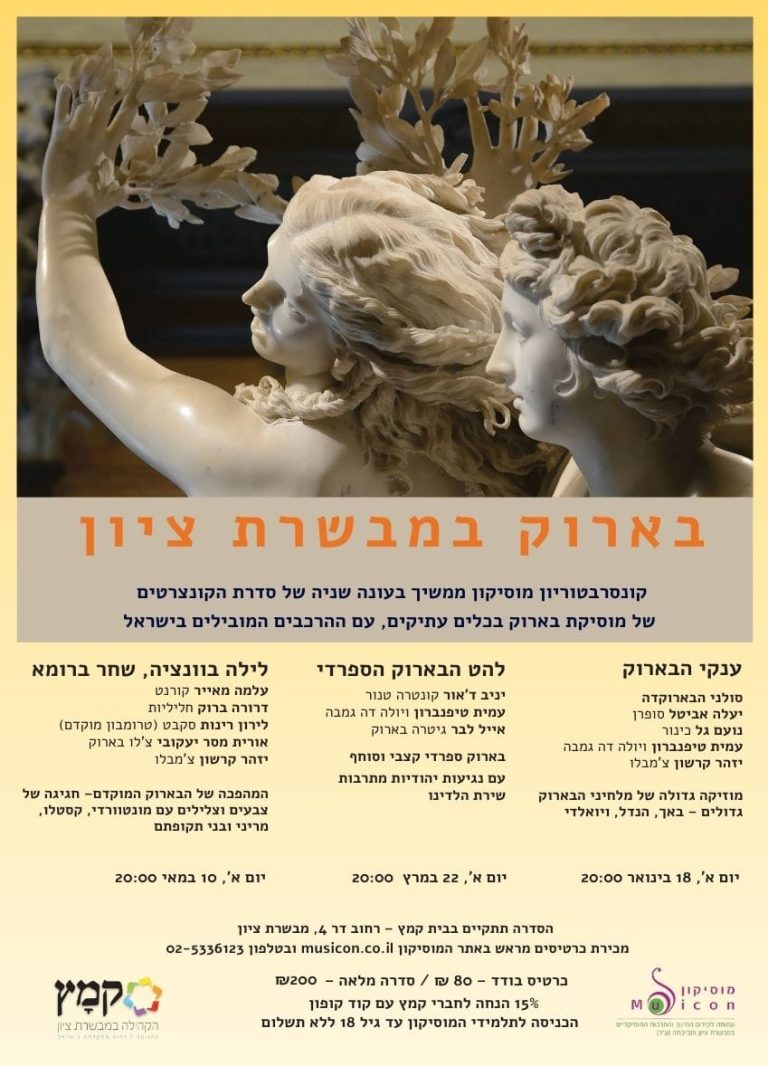 קונצרטים מסדרת הבארוק יתקיימו בתאריכים הבאים, בשעה 20:00 בבית קמץ, רחוב דר 4 מבשרת ציון: