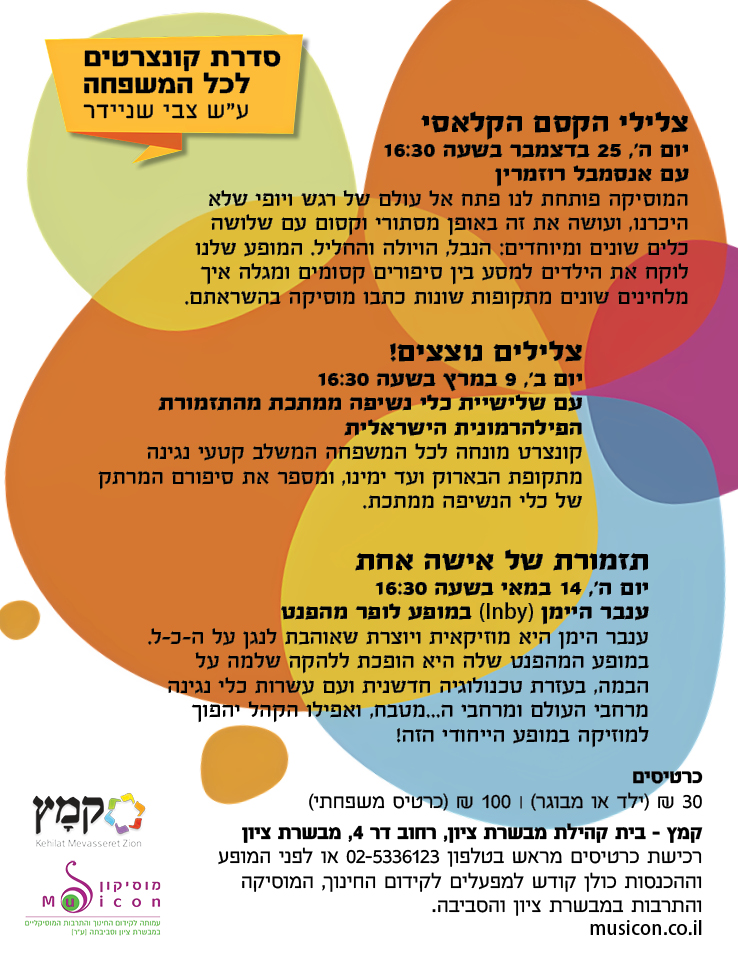קונצרטים לילדים בקהילת קמץ בשעה 16:30 אחר הצהרים בתאריכים הבאים:
